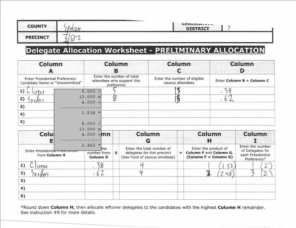 In Precinct 3102, the allocation of the four delegates on March 26 was 3 Sanders and 1 Clinton. Upon review of the Precinct 3102 Delegate Allocation Worksheet, the Credentials Committee determined that an inadvertent error had occurred. In Phase One of the allocation (where the calculations are rounded down), Sanders' 2.462 is rounded down to two delegates and Clinton's 1.538 is rounded down to one delegate. With one remaining delegate to be allocated from the precinct, the Phase Two part of the calculation involves looking to the right of the decimal point. Clinton's .538 is higher than Sanders' .462, so under Party rules the remaining delegate is allocated to Clinton. Thus, the precinct's allocation of delegates should have been 2 Sanders and 2 Clinton.