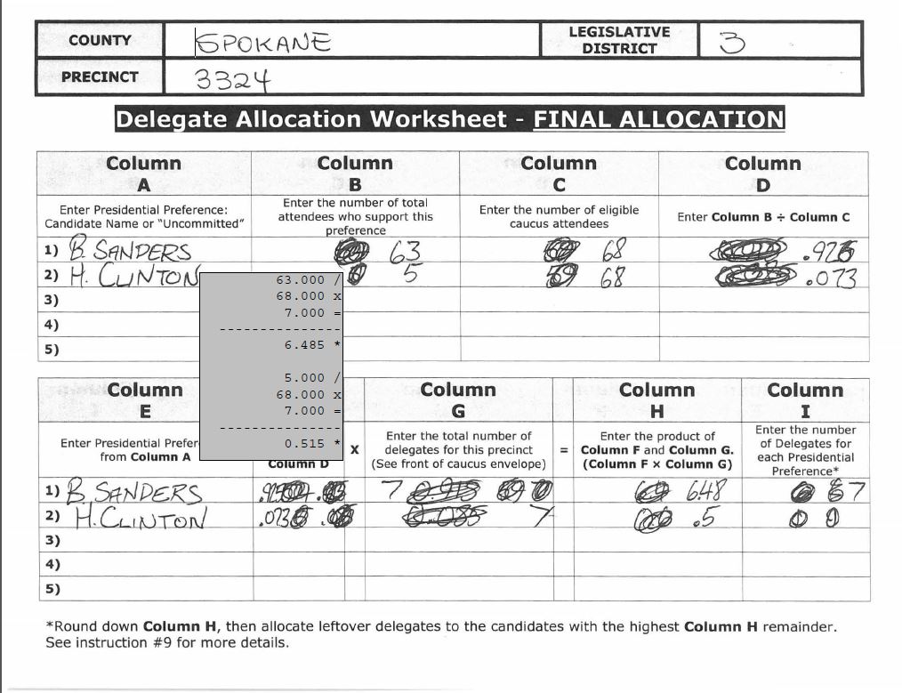 In Precinct 3324, the allocation of the seven delegates on March 26 was 7 Sanders and 0 Clinton. Upon review of the Precinct 3324 Delegate Allocation Worksheet, the Credentials Committee determined that an inadvertent error had occurred. In Phase One of the allocation (where the calculations are rounded down), Sanders' 6.485 is rounded down to six delegates and Clinton's 0.515 is rounded down to zero delegates. With one remaining delegate to be allocated from the precinct, the Phase Two part of the calculation involves looking to the right of the decimal point. Clinton's .515 is higher than Sanders' .485, so under Party rules the remaining delegate is allocated to Clinton. Thus, the precinct's allocation of delegates should have been 6 Sanders and 1 Clinton.